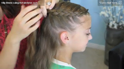 A trança começa na franja e vai dando a volta na cabeça até formar um S;